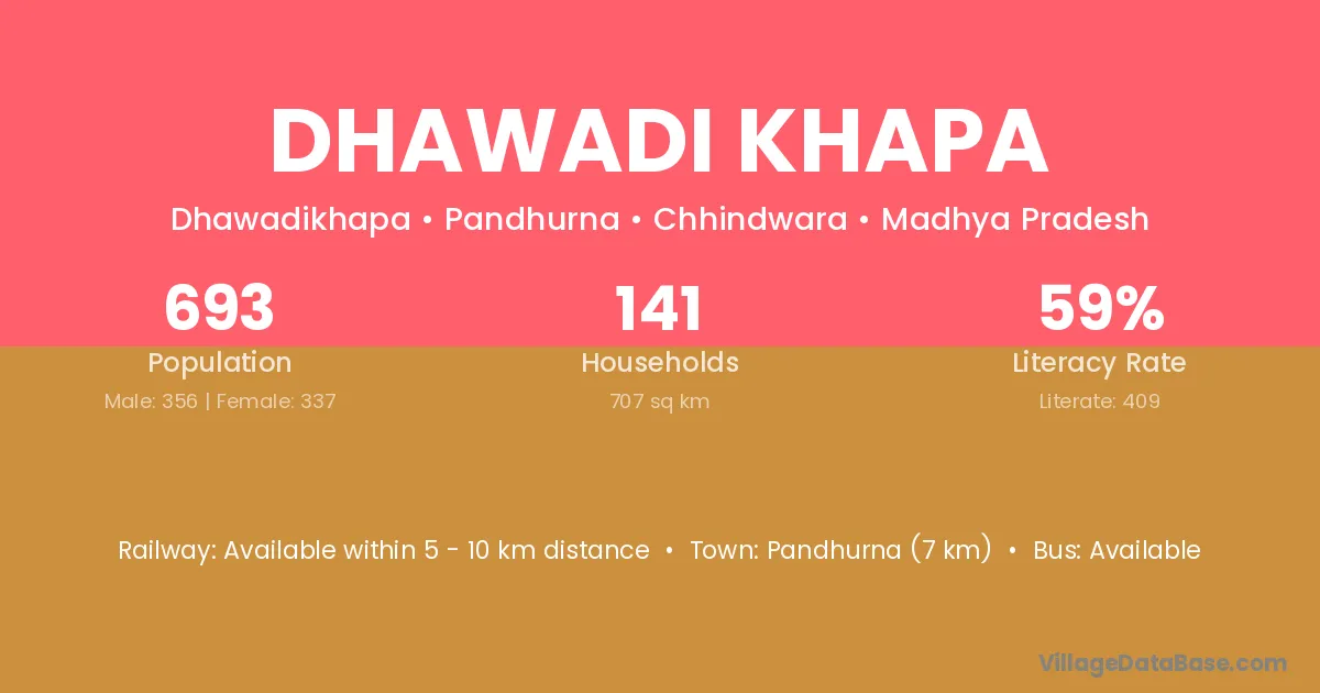 Dhawadi Khapa village has a total population of 693 people, of which 356 are males and 337 are females.