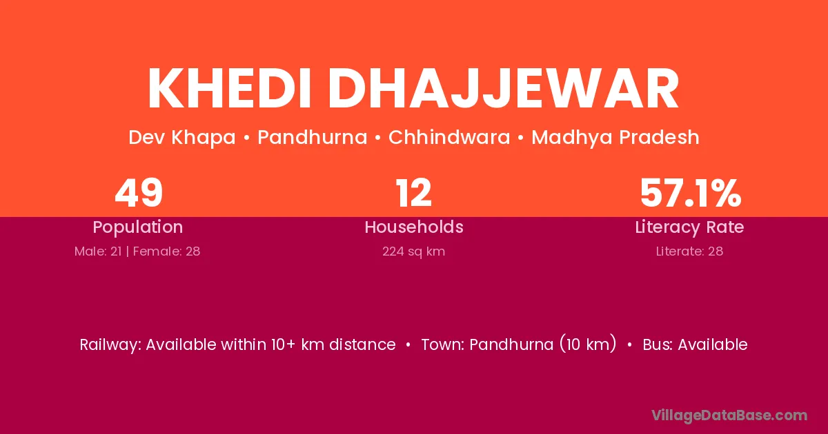 Khedi Dhajjewar village has a total population of 49 people, of which 21 are males and 28 are females.