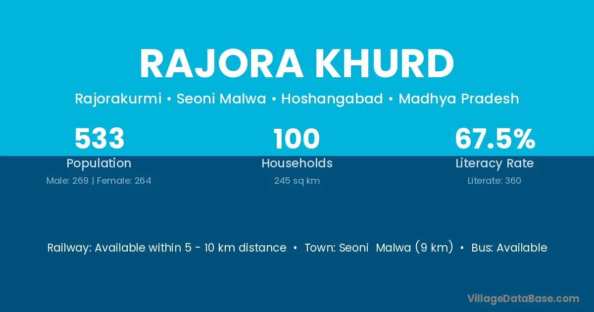 Pandhurna (6 km) is the nearest town to Rajora Khurd village for major economic activities and is located approximately 6 km away.