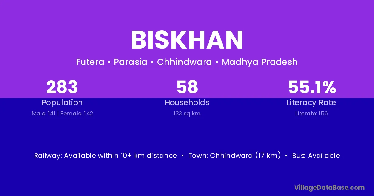 Chhindwara (17 km) is the nearest town to Biskhan village for major economic activities and is located approximately 17 km away.