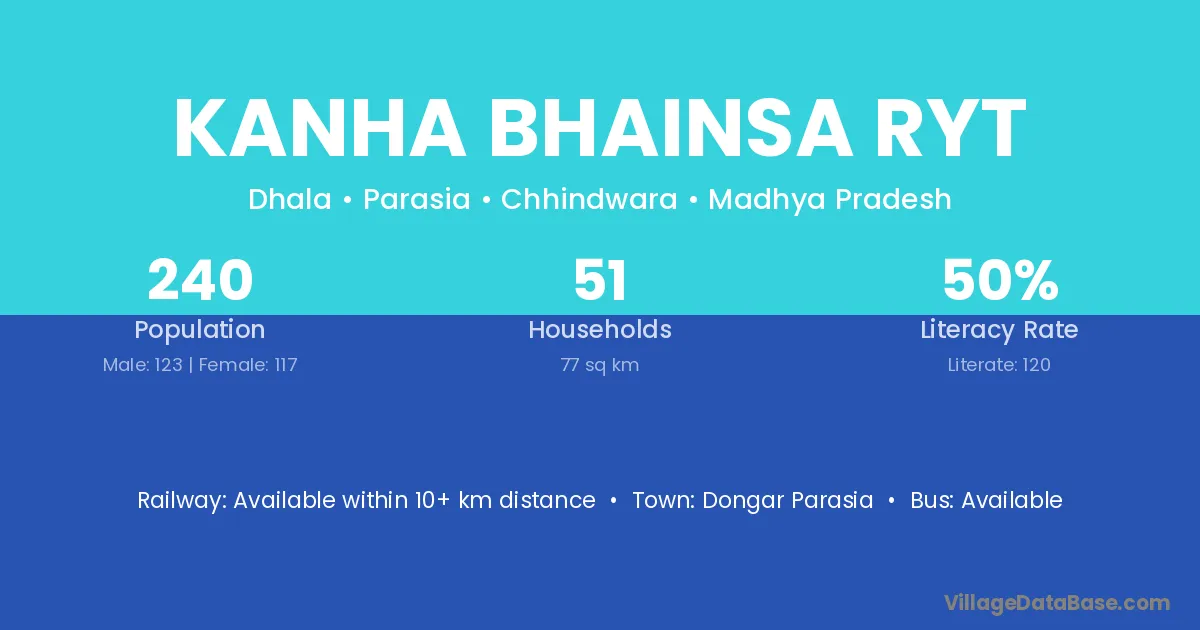 Kanha Bhainsa Ryt village has a total population of 240 people, of which 123 are males and 117 are females.