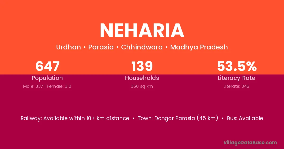Dongar Parasia (45 km) is the nearest town to Neharia village for major economic activities and is located approximately 45 km away.