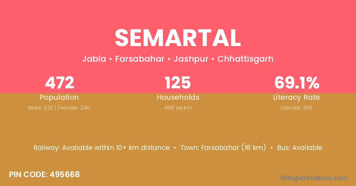 The literacy rate of Semartal village is 60.74%. Male literacy stands at 67.66% and female literacy at 53.92%.