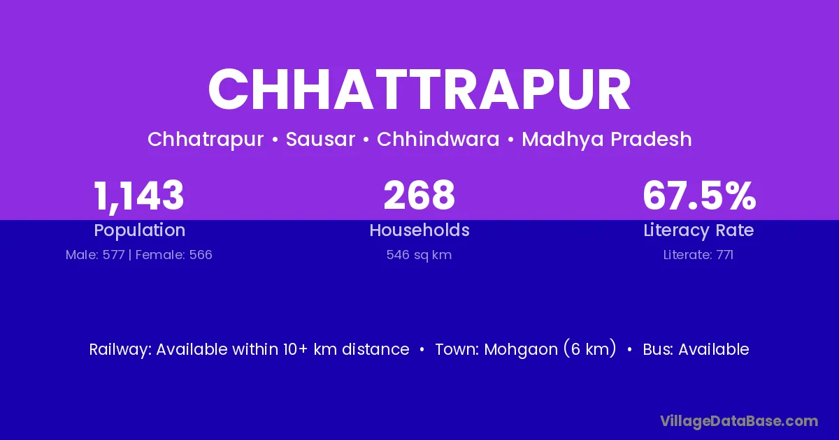 Mohgaon (6 km) is the nearest town to Chhattrapur village for major economic activities and is located approximately 6 km away.