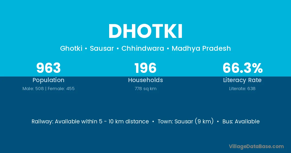 Sausar (9 km) is the nearest town to Dhotki village for major economic activities and is located approximately 9 km away.