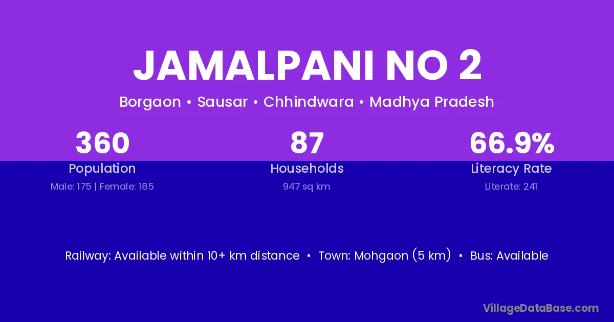 Mohgaon (5 km) is the nearest town to Jamalpani No 2 village for major economic activities and is located approximately 5 km away.