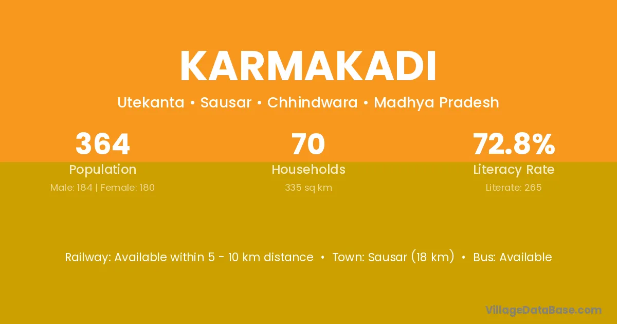 Karmakadi village has a total population of 364 people, of which 184 are males and 180 are females.