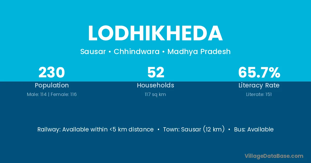 Lodhikheda village has a total population of 230 people, of which 114 are males and 116 are females.