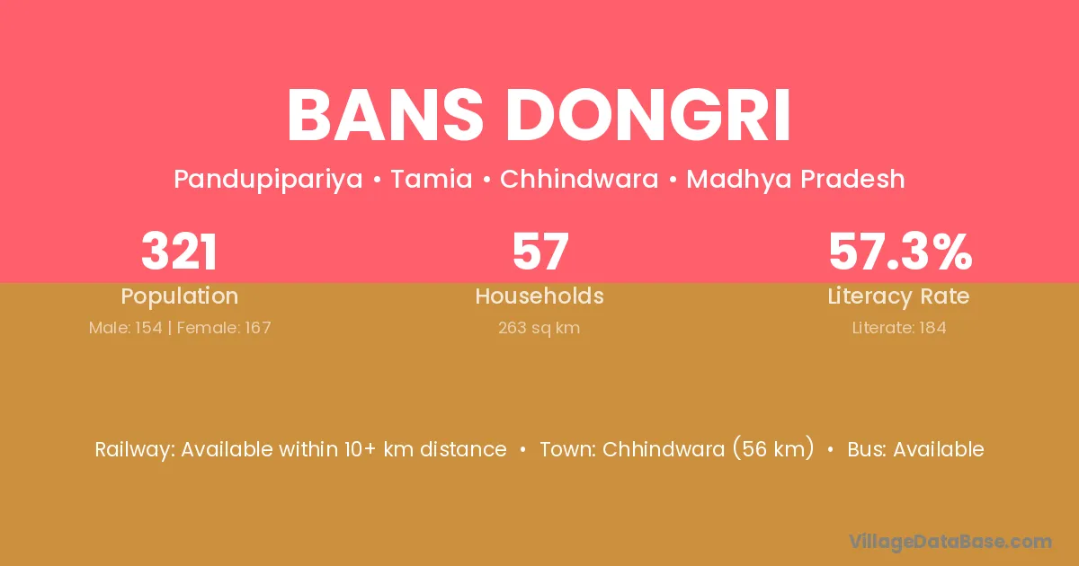 Chhindwara (56 km) is the nearest town to Bans Dongri village for major economic activities and is located approximately 56 km away.