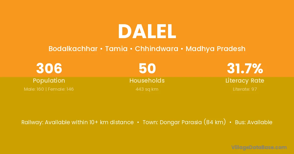 Dongar Parasia (84 km) is the nearest town to Dalel village for major economic activities and is located approximately 84 km away.