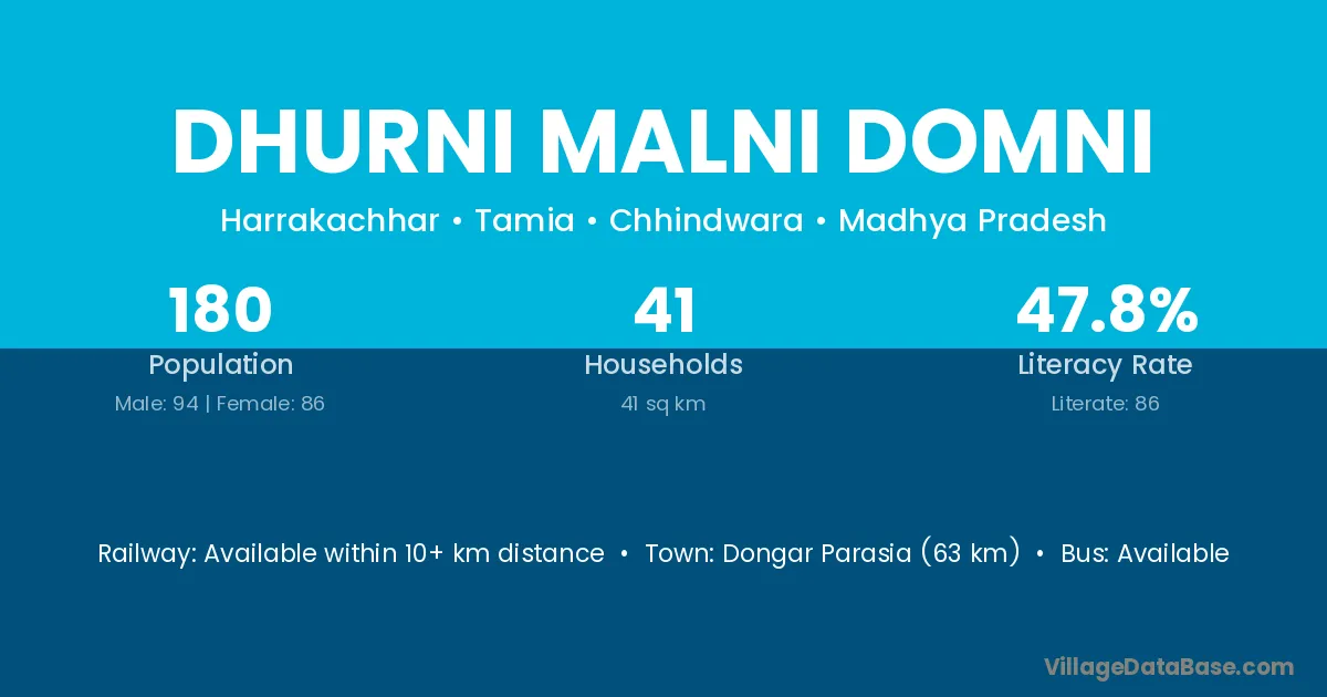 Dongar Parasia (63 km) is the nearest town to Dhurni Malni Domni village for major economic activities and is located approximately 63 km away.