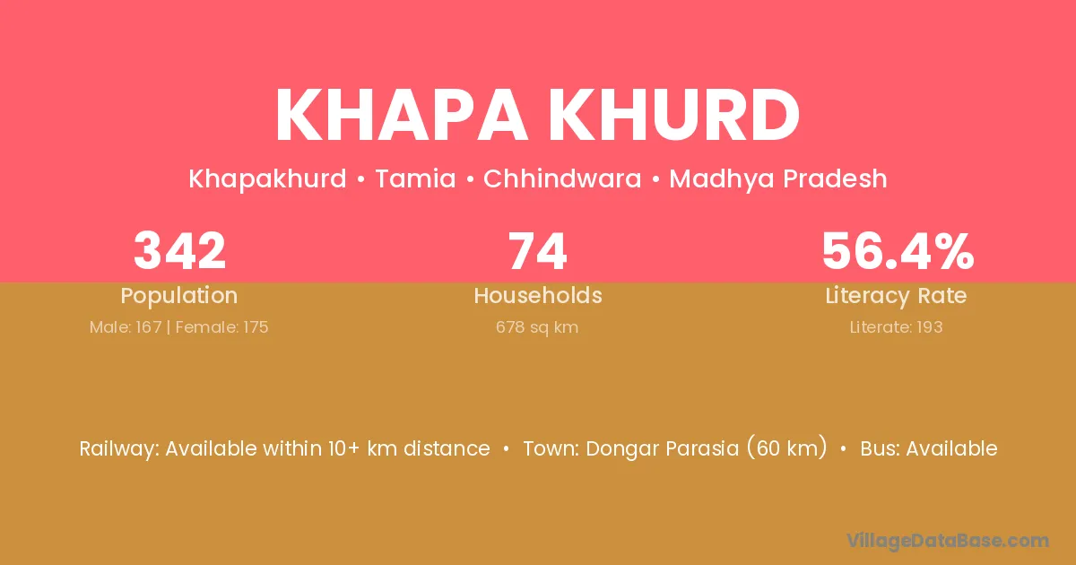Dongar Parasia (60 km) is the nearest town to Khapa Khurd village for major economic activities and is located approximately 60 km away.