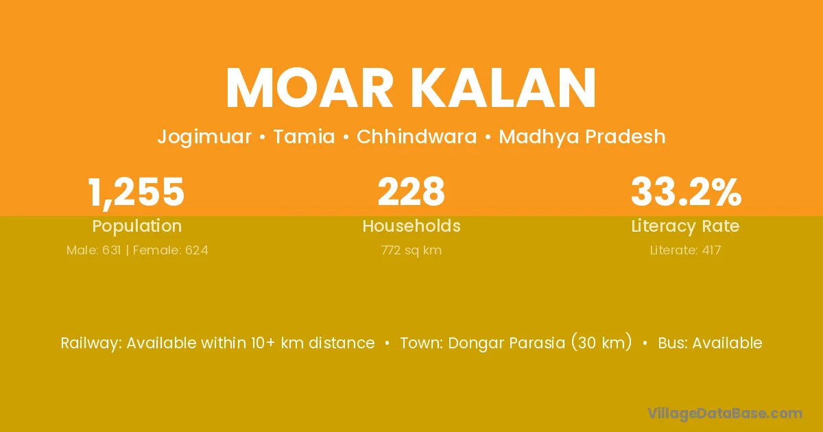 Dongar Parasia (30 km) is the nearest town to Moar Kalan village for major economic activities and is located approximately 30 km away.