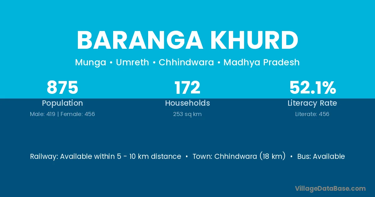 Chhindwara (18 km) is the nearest town to Baranga Khurd village for major economic activities and is located approximately 18 km away.