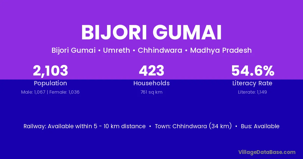 Chhindwara (34 km) is the nearest town to Bijori Gumai village for major economic activities and is located approximately 34 km away.