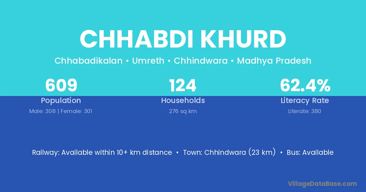 Chhabdi Khurd village has a total population of 609 people, of which 308 are males and 301 are females.
