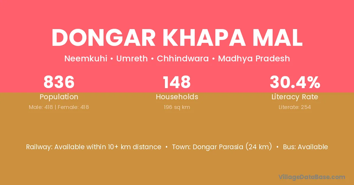 Dongar Parasia (24 km) is the nearest town to Dongar Khapa Mal village for major economic activities and is located approximately 24 km away.