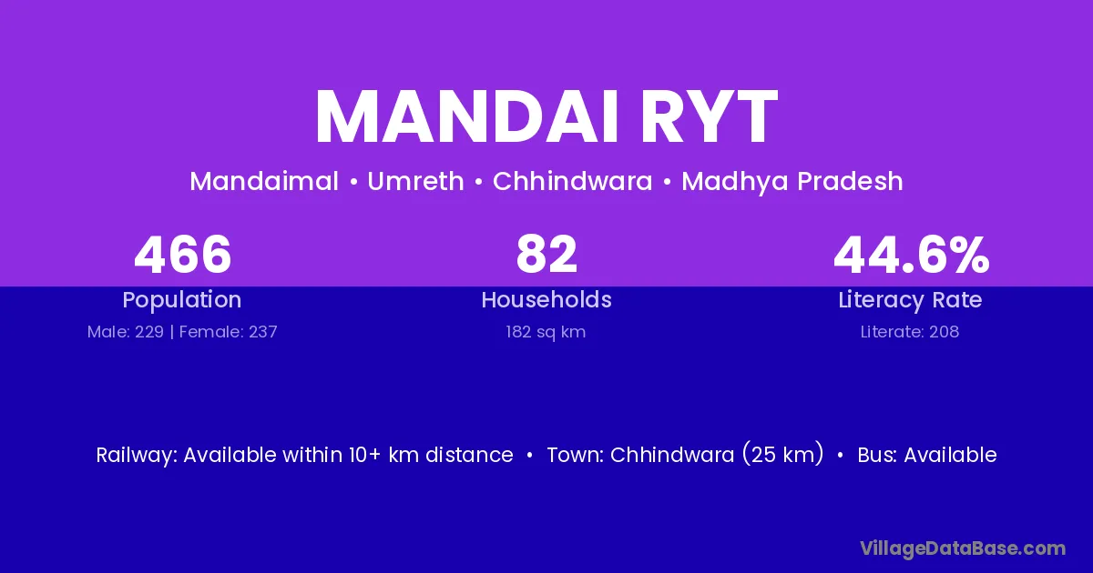 Chhindwara (25 km) is the nearest town to Mandai Ryt village for major economic activities and is located approximately 25 km away.