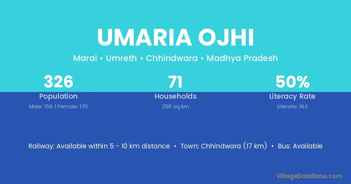 Chhindwara (17 km) is the nearest town to Umaria Ojhi village for major economic activities and is located approximately 17 km away.