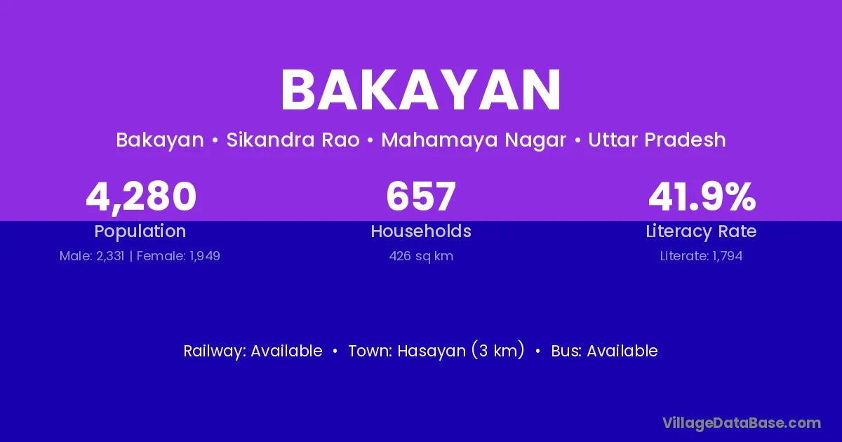 The literacy rate of Bakayan village is 68.60%. Male literacy stands at 79.53% and female literacy at 57.34%.