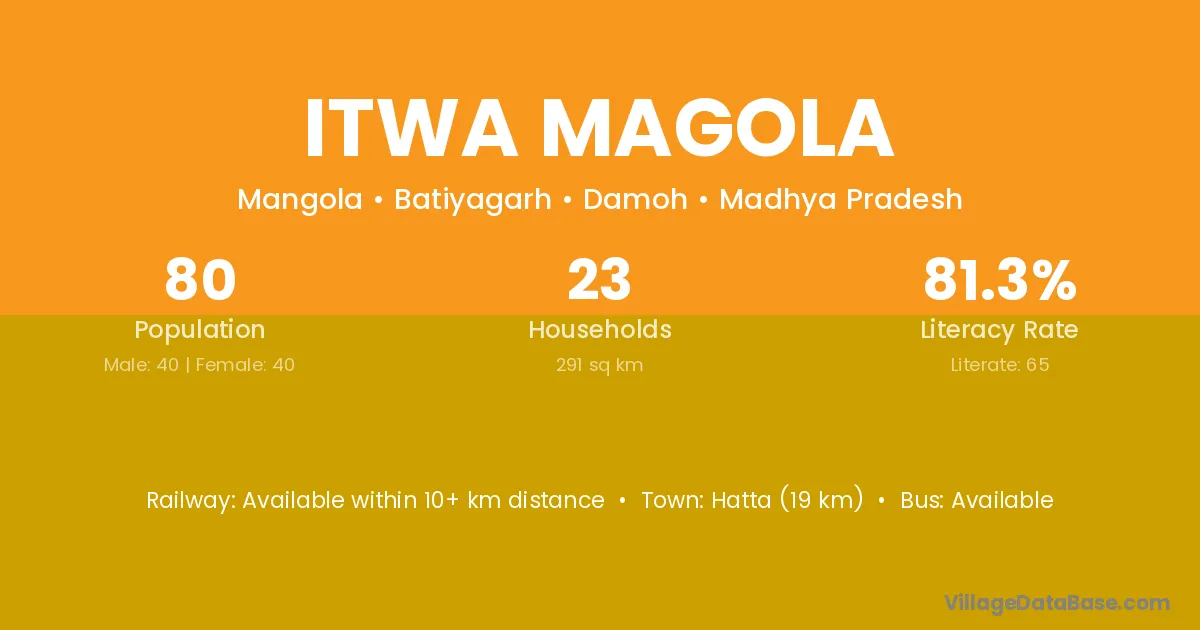 Itwa Magola village has a total population of 80 people, of which 40 are males and 40 are females.