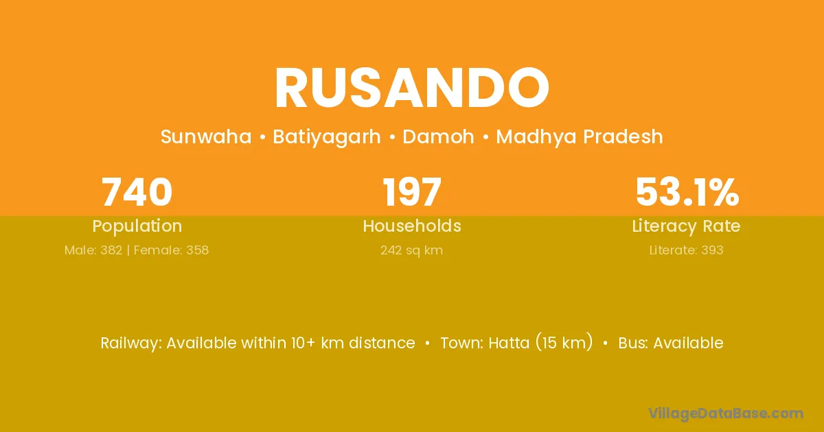 Hatta (15 km) is the nearest town to Rusando village for major economic activities and is located approximately 15 km away.