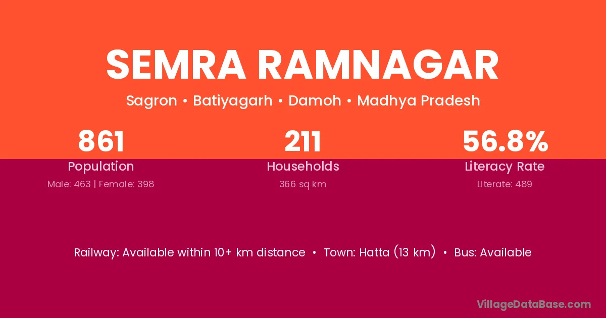 Semra Ramnagar village has a total population of 861 people, of which 463 are males and 398 are females.