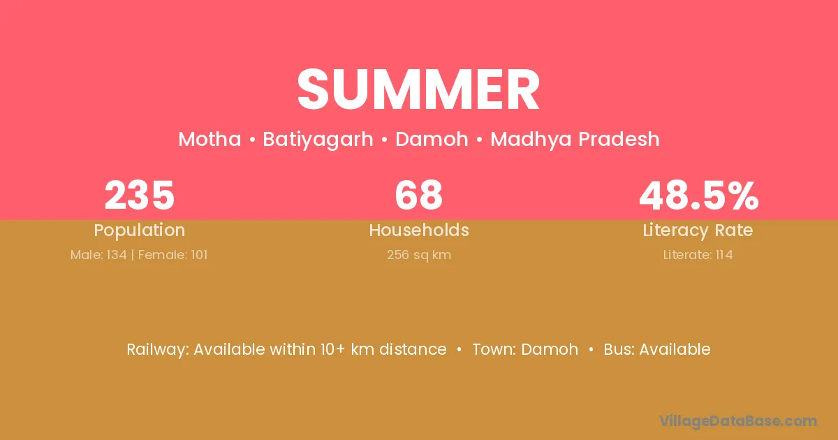 The literacy rate of Summer village is 48.51%. Male literacy stands at 52.24% and female literacy at 43.56%.