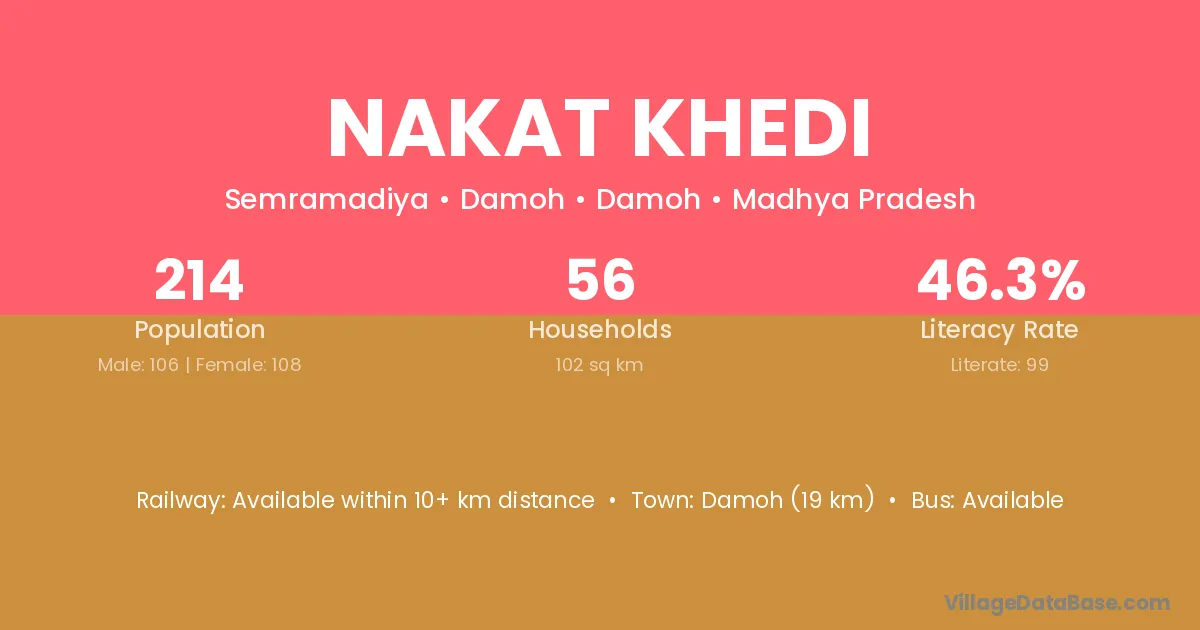 Nakat Khedi village has a total population of 214 people, of which 106 are males and 108 are females.