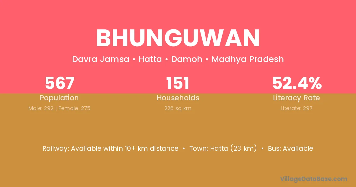 Hatta (23 km) is the nearest town to Bhunguwan village for major economic activities and is located approximately 23 km away.