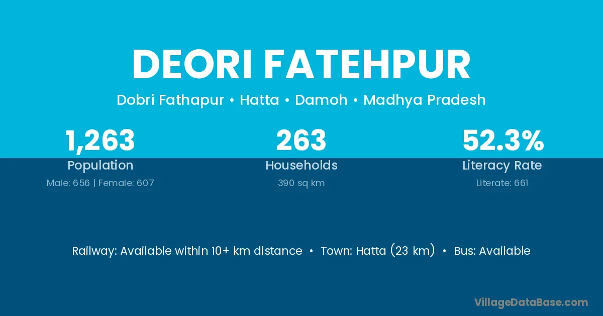 Deori Fatehpur village has a total population of 1,263 people, of which 656 are males and 607 are females.