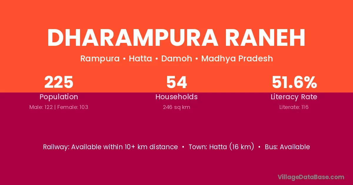 Hatta (16 km) is the nearest town to Dharampura Raneh village for major economic activities and is located approximately 16 km away.