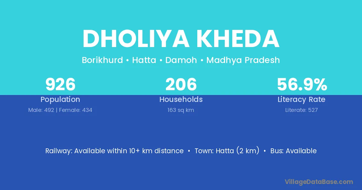 Dholiya Kheda village has a total population of 926 people, of which 492 are males and 434 are females.