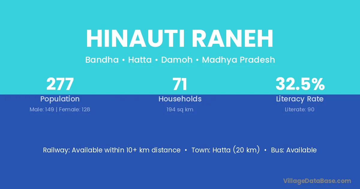 Hatta (20 km) is the nearest town to Hinauti Raneh village for major economic activities and is located approximately 20 km away.