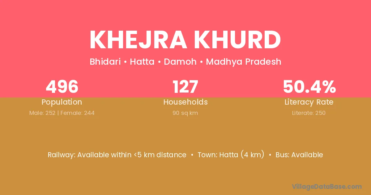 Khejra Khurd village has a total population of 496 people, of which 252 are males and 244 are females.