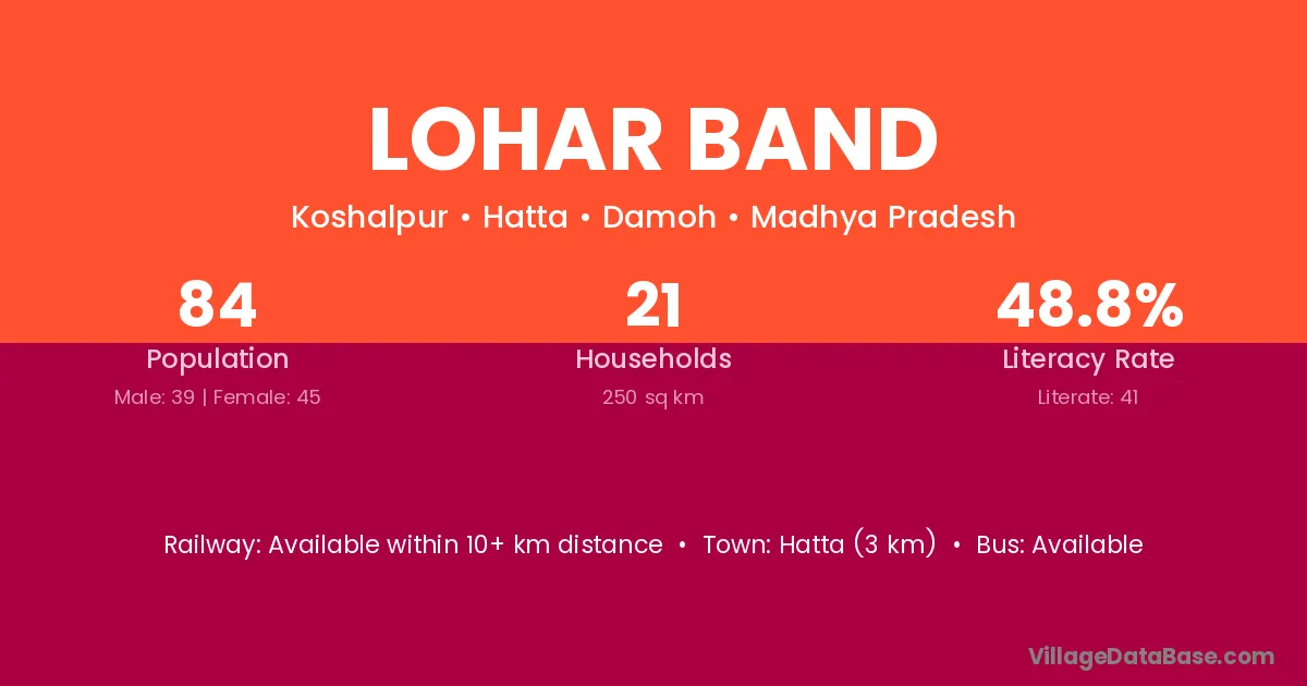 Lohar Band village has a total population of 84 people, of which 39 are males and 45 are females.