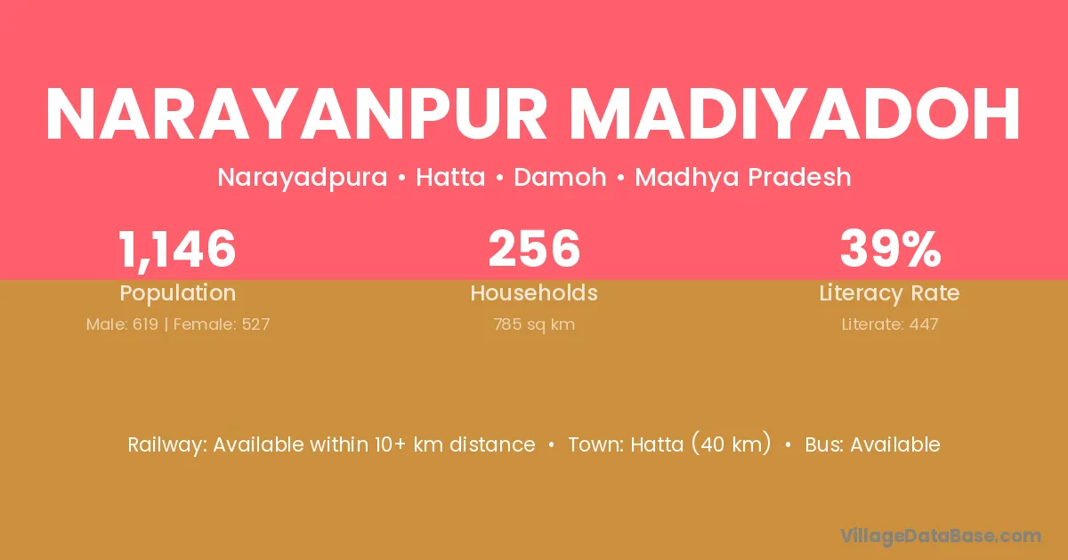 Hatta (40 km) is the nearest town to Narayanpur Madiyadoh village for major economic activities and is located approximately 40 km away.