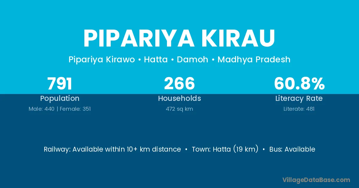 Hatta (19 km) is the nearest town to Pipariya Kirau village for major economic activities and is located approximately 19 km away.