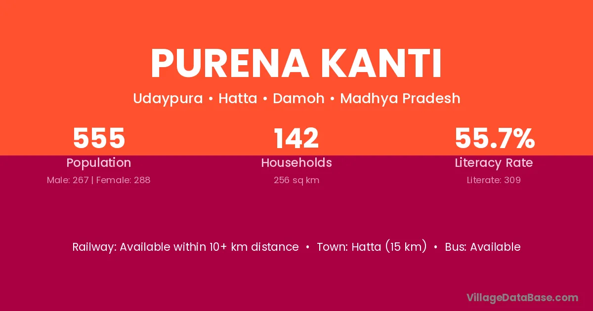 Purena Kanti village has a total population of 555 people, of which 267 are males and 288 are females.