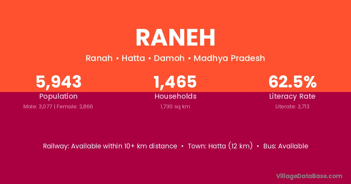 Raneh village has a total population of 5,943 people, of which 3,077 are males and 2,866 are females.