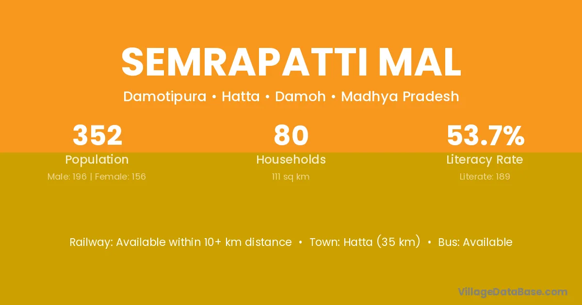 Semrapatti Mal village has a total population of 352 people, of which 196 are males and 156 are females.