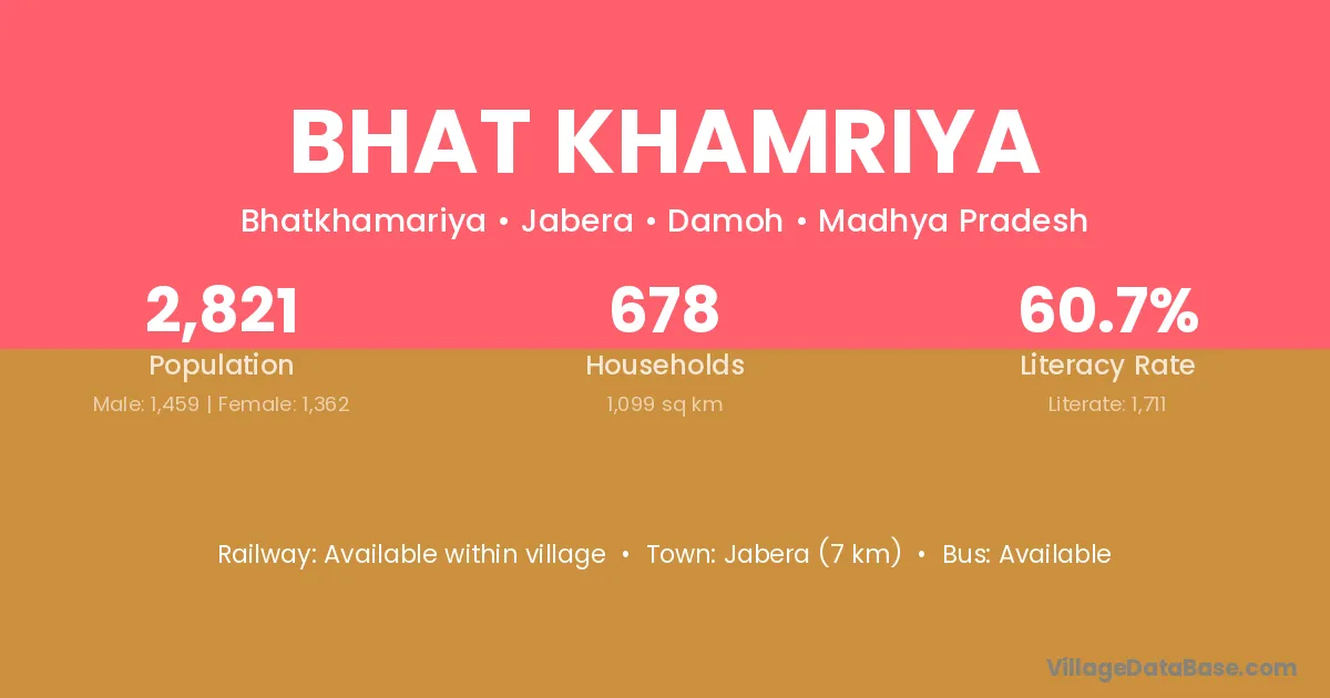 Jabera (7 km) is the nearest town to Bhat Khamriya village for major economic activities and is located approximately 7 km away.