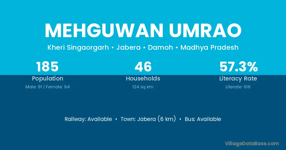 Jabera (6 km) is the nearest town to Mehguwan Umrao village for major economic activities and is located approximately 6 km away.