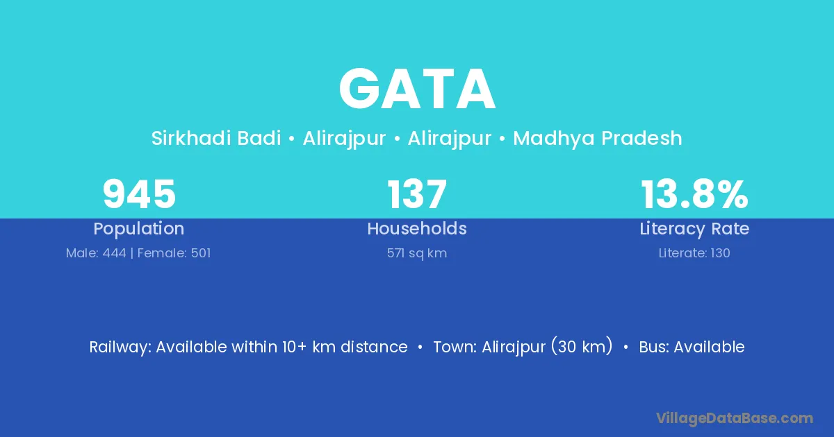 The literacy rate of Gata village is 57.20%. Male literacy stands at 72.10% and female literacy at 41.73%.