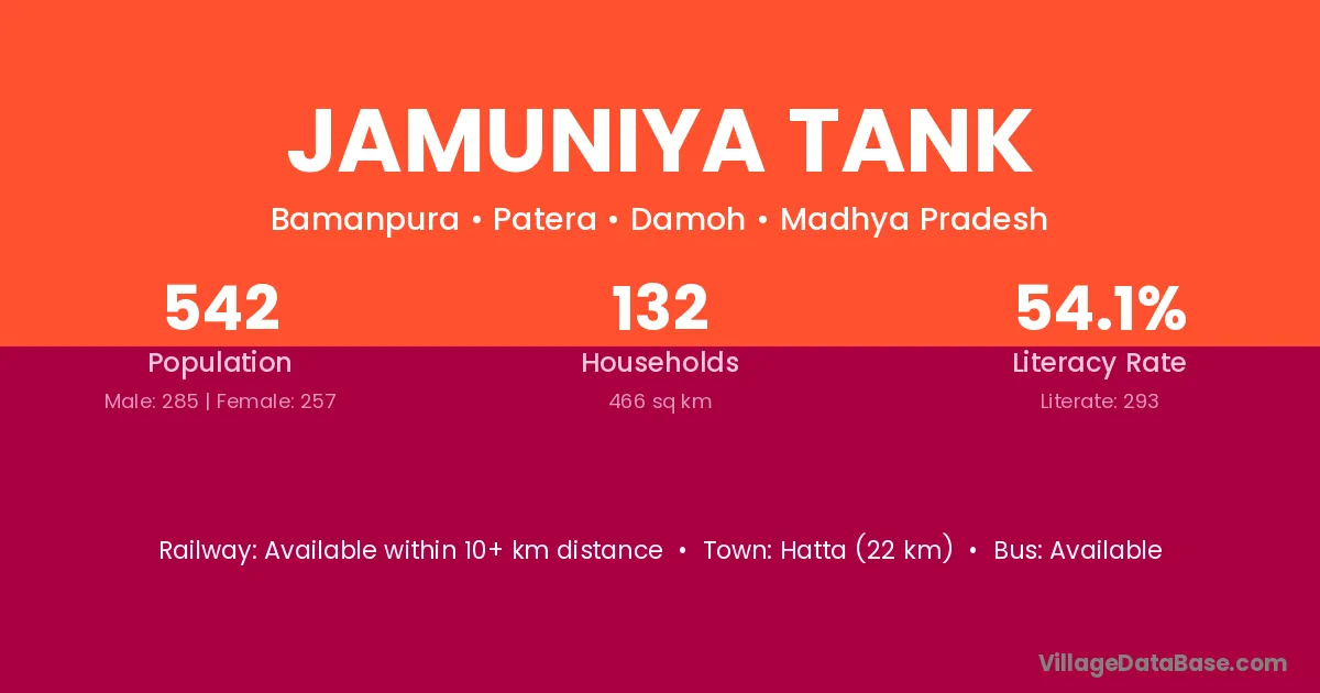 Jamuniya Tank village has a total population of 542 people, of which 285 are males and 257 are females.