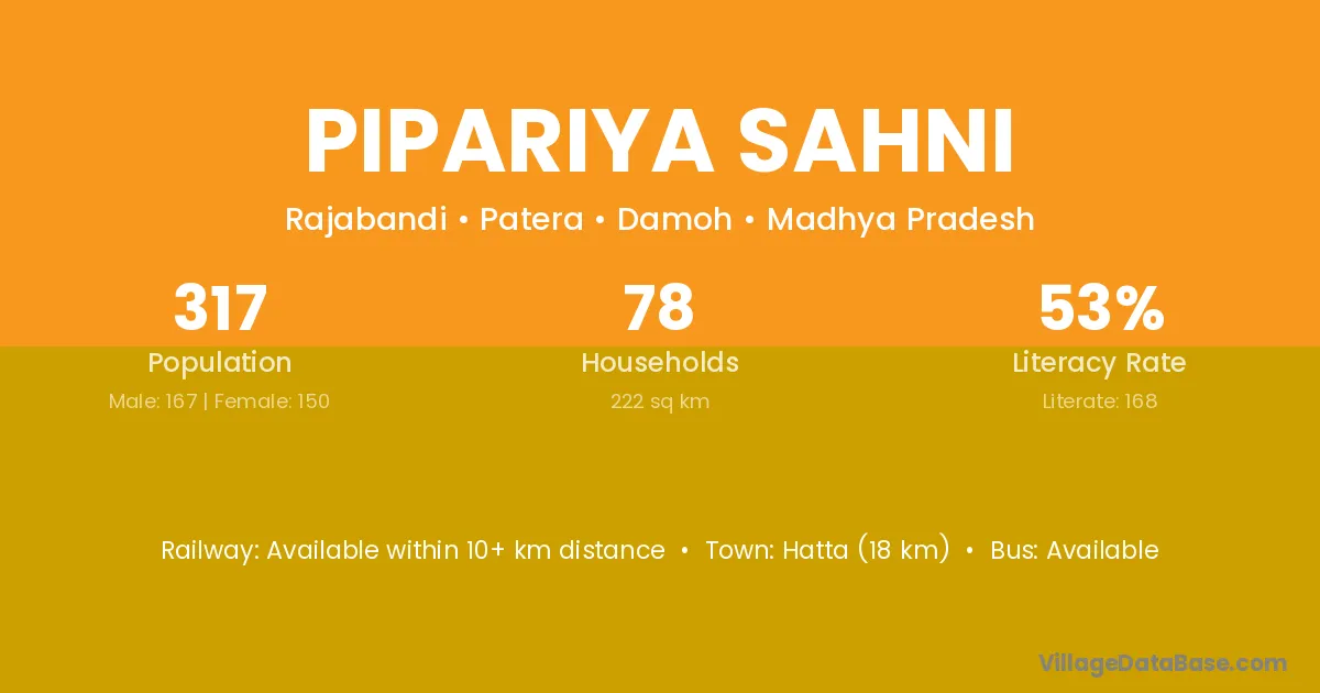 Hatta (18 km) is the nearest town to Pipariya Sahni village for major economic activities and is located approximately 18 km away.