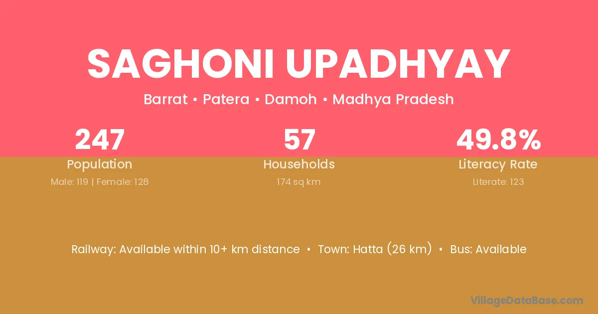 Saghoni Upadhyay village has a total population of 247 people, of which 119 are males and 128 are females.