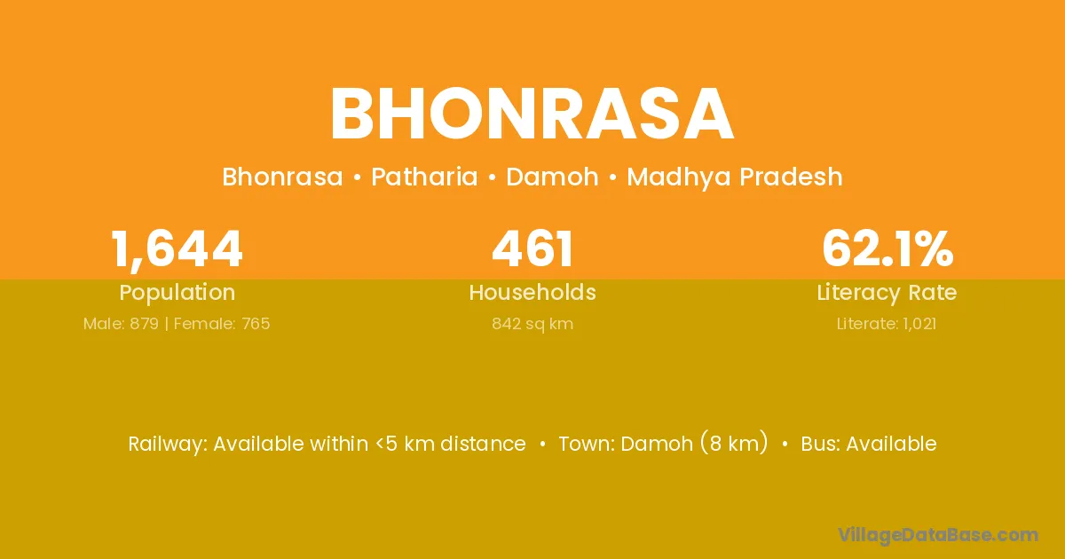 Damoh (8 km) is the nearest town to Bhonrasa village for major economic activities and is located approximately 8 km away.