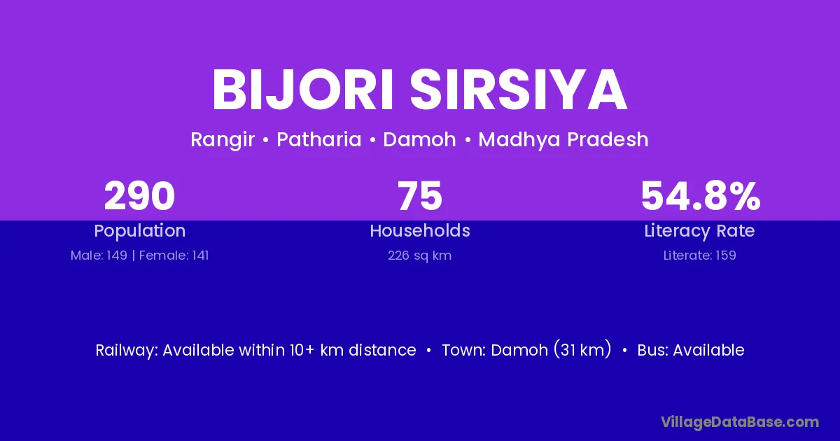 Damoh (31 km) is the nearest town to Bijori Sirsiya village for major economic activities and is located approximately 31 km away.