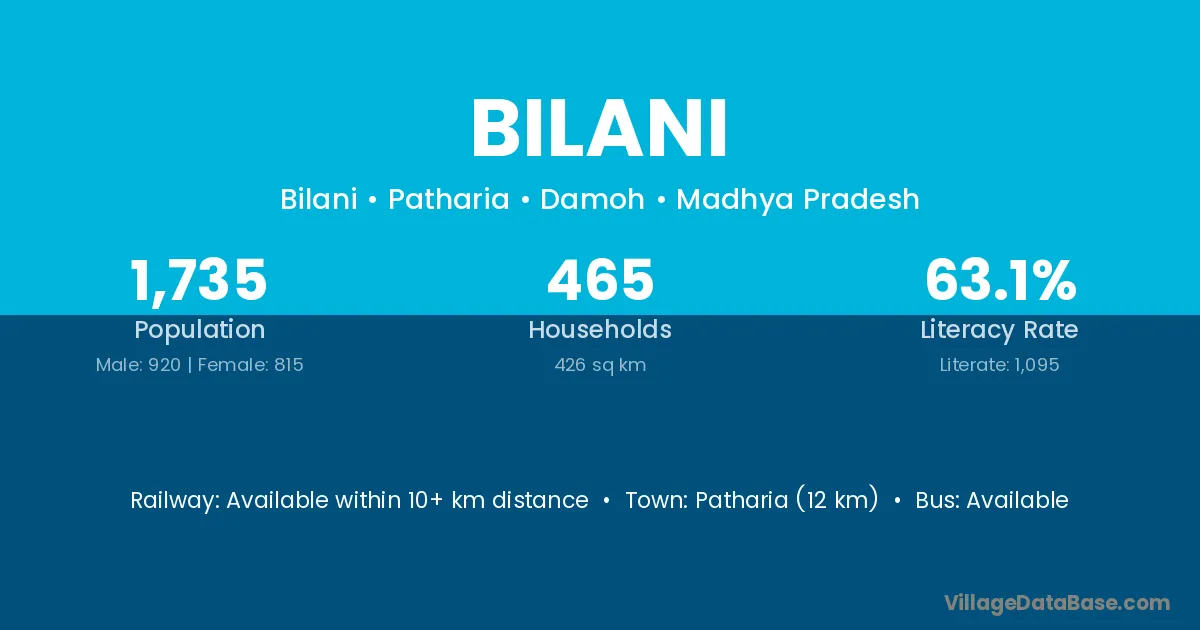 Patharia (12 km) is the nearest town to Bilani village for major economic activities and is located approximately 12 km away.